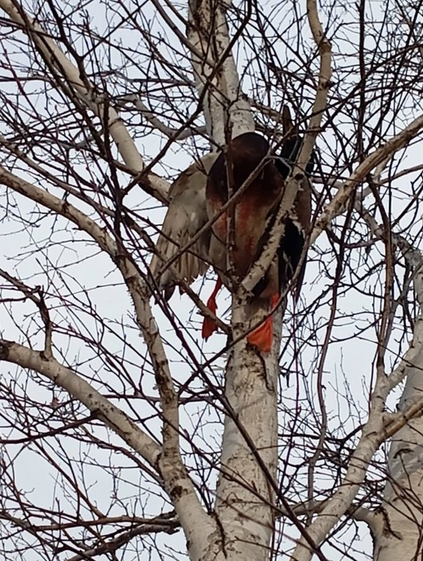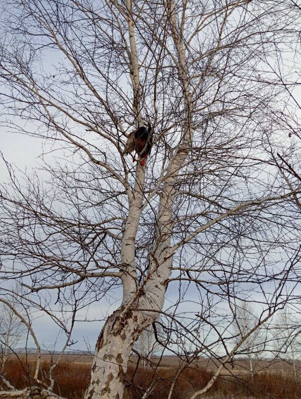 Принес селезня в скрадок. Хотел сфоткать в скрадке. Слышу жвяканье. Кладу телефон. Налетает пара. Высота метров 30. Летят быстро, да еще по ветру. Беру упреждение два корпуса, бью почти над головой, вторым добавляю. Смотрю за селезнем. После первого выстрела его как-то подкинуло…. Селезень летит в сторону леса, ударяется об березу. и скатывается. Опять подранок . Заряжаесь и бегу в сторону леска. В голове мысли — не найду, не найду скорее всего. Чтобы до леса добежать, а до него метров 80. надо пролезть через тальник-ивняк. А он высотой около трех метров. Продираюсь сквозь ивняк, хорошо что не широкий — метров 10 всего, но густой. Ориентиры уже потерял. Ищу селезня. Расстроился уже. Кружусь между берез и кустов. Поднимаю голову — ба…. вон он в ветках дерева. Вот это да…. Такое у меня впервые. Решил его сфоткать на дереве. А где телефон? Твою же раскудрит… Потерял что ли… Нет, наверное в скрадке лежит. Хотел ведь того добранного подранка сфоткать. Опять бегом в шалаш маршбросок метров 80. Забрал телефон, опять к селезню, который на березе висит. Надо же… И такое бывает…