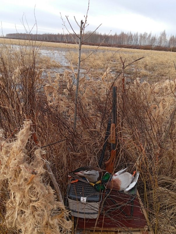 Поднял 4-5 пар кряковых. Настроение супер! Разлив хороший. Подновил шалаш, масксеть на стяжки, нарезал тальника, утку на воду, все, готов….